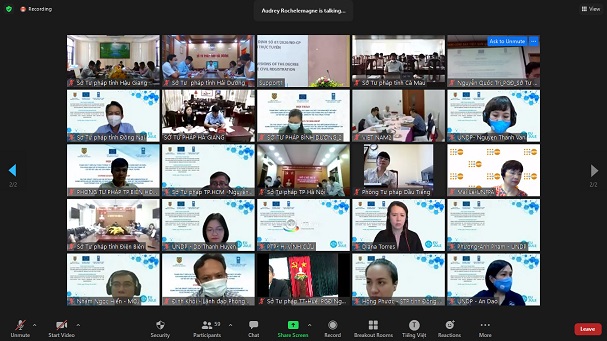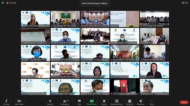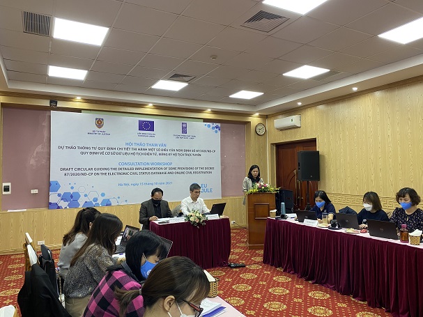 Để hoàn thiện dự thảo Thông tư, nhằm tạo thuận lợi cho người dân, đặc biệt là nhóm yếu thế, người dân, trẻ em ở tại khu vực miền núi, vùng sâu, vùng xa, vùng đồng bào dân tộc thiểu số thực hiện quyền đăng ký hộ tịch, trong khuôn khổ Dự án “Tăng cường pháp luật và tư pháp tại Việt Nam - EU JULE”, ngày 15/10/2021, Cục Hộ tịch, quốc tịch, chứng thực đã tổ chức Hội thảo tham vấn ý kiến dự thảo Thông tư với sự tham gia của các bộ, ngành, cơ quan Trung ương (Bộ Công an, Bộ Ngoại giao, Bảo hiểm xã hội Việt Nam, một số đơn vị chuyên môn thuộc Bộ Tư pháp…) và các cơ quan đăng ký, quản lý hộ tịch địa phương của 11 tỉnh, thành phố (TP Hà Nội, TP Hải Phòng, TP Hồ Chí Minh, Hải Dương, Điện Biên, Hà Giang, Thừa Thiên Huế, Đồng Nai, Bình Dương, Hậu Giang, Cà Mau). Hội thảo do Tiến sỹ Nguyễn Công Khanh - Cục trưởng Cục Hộ tịch, quốc tịch, chứng thực chủ trì, được tổ chức bằng hình thức trực tuyến với 02 điểm cầu trung tâm tại thành phố Hà Nội và 11 điểm cầu tại 11 tỉnh, thành phố, bảo đảm thực hiện nghiêm chỉnh các quy định của cơ quan chức năng trong thời gian phòng chống dịch bệnh covid-19.