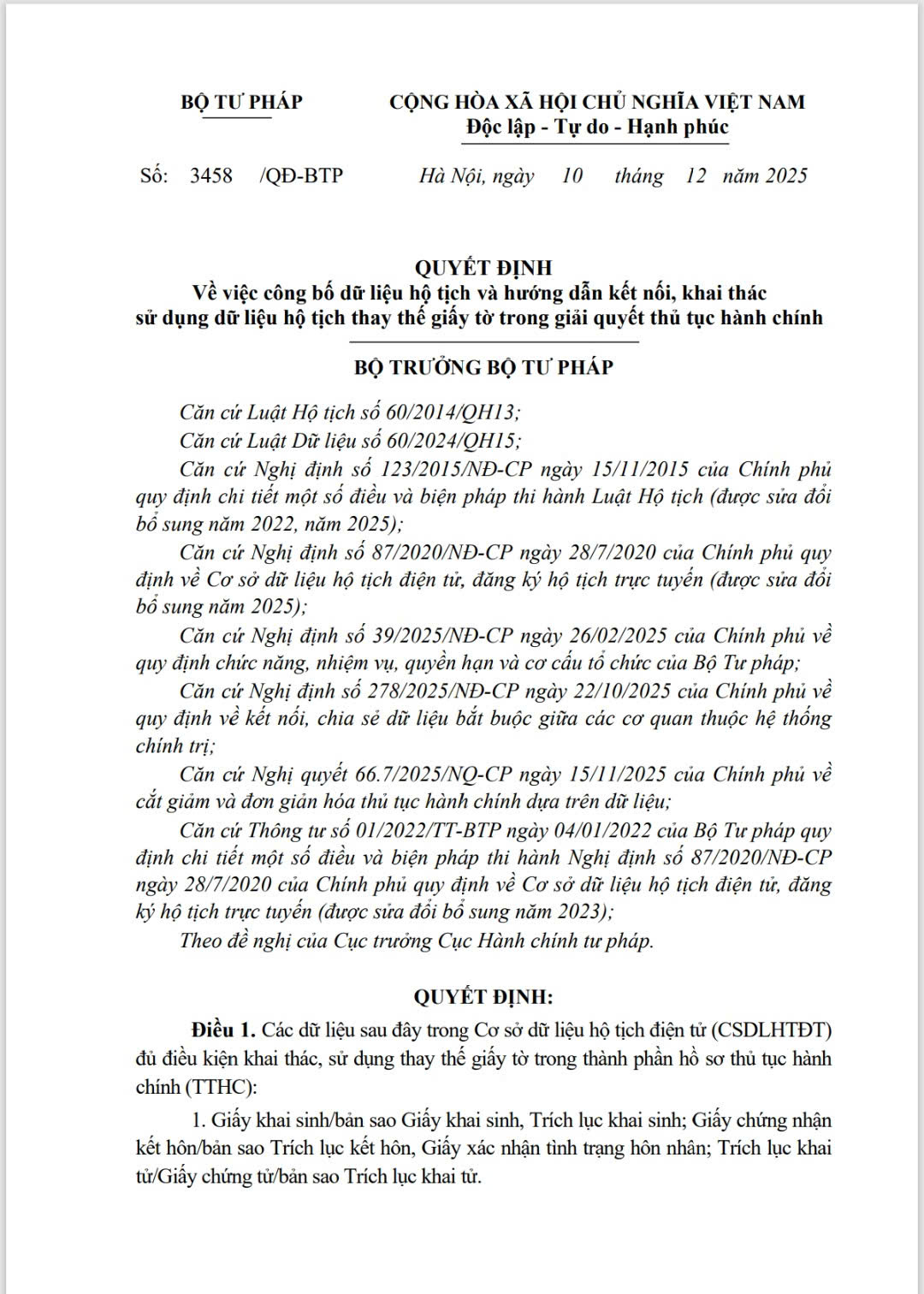 Ngày 10/12/2025, Bộ Tư pháp ban hành Quyết định số 3458/BTP-HCTP công bố các dữ liệu trong Cơ sở dữ liệu hộ tịch điện tử (CSDLHTĐT) đủ điều kiện khai thác, sử dụng thay thế giấy tờ trong thành phần hồ sơ giải quyết thủ tục hành chính (TTHC). Đây là động thái có ý nghĩa đặc biệt quan trọng trong triển khai Nghị quyết số 66.7/2025/NQ-CP của Chính phủ về cắt giảm, đơn giản hóa TTHC dựa trên dữ liệu – một trong những định hướng cải cách lớn nhất trong giai đoạn chuyển đổi số quốc gia hiện nay.