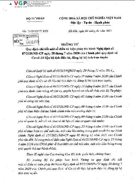 Ngày 04/01/2022, Bộ trưởng Bộ Tư pháp đã ban hành Thông tư số 01/2022/TT-BTP quy định chi tiết một số điều và biện pháp thi hành Nghị định số 87/2020/NĐ-CP ngày 28/7/2020 của Chính phủ quy định về Cơ sở dữ liệu hộ tịch điện tử, đăng ký hộ tịch trực tuyến. Thông tư có hiệu lực kể từ ngày 18/02/2022. Để triển khai thực hiện thống nhất trên toàn quốc các quy định của Thông tư số 01/2022/TT-BTP, Cục Hộ tịch, quốc tịch, chứng thực đã ban hành Công văn số 95/HTQTCT-HT ngày 18/02/202, triển khai thực hiện các quy định của Thông tư số 01/2022/TT-BTP ngày 04/01/2022 gửi Sở Tư pháp các tỉnh, thành phố trực thuộc Trung ương với các nội dung sau: