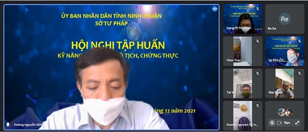 Để tiếp tục triển khai thực hiện có hiệu quả Kế hoạch số 1633/KH-UBND ngày 09/5/2017 của Ủy ban nhân dân tỉnh Ninh Thuận, về thực hiện Chương trình hành động quốc gia của Việt Nam về đăng ký và thống kê hộ tịch giai đoạn 2017-2024; ngày 29 và 30/12/2021, Sở Tư pháp tổ chức Hội nghị (trực tuyến trên nền tảng ứng dụng công nghệ Zoom) tập huấn kỹ năng, nghiệp vụ hộ tịch, chứng thực cho đội ngũ công chứng viên, cán bộ, công chức làm công tác hộ tịch, chứng thực tại Phòng Tư pháp các huyện, thành phố và công chức Tư pháp - Hộ tịch tại các xã, phường, thị trấn trên địa bàn tỉnh. Ông Lê Quyện - Phó Giám đốc phụ trách Sở dự và phát biểu chỉ đạo Hội nghị. Trực tiếp triển khai nội dung tập huấn là Bà Lê Thị Minh Long - Thạc sĩ, Báo cáo viên pháp luật Trung ương.