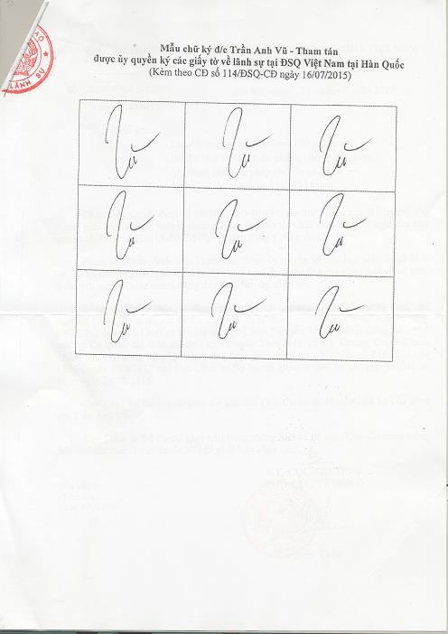 Thực hiện Quyết định số 05/2002/QĐ-BNG ngày 30/7/2002 của Bộ trưởng Bộ Ngoại giao quy định về việc tổ chức giải quyết công tác lãnh sự, căn cứ đề nghị của Đại sứ quán Việt Nam tại Hàn Quốc, Bộ Ngoại giao đồng ý chấp thuận: đồng chí Trần Anh Vũ - Tham tán Đại sứ quán Việt Nam tại Hàn Quốc được ủy quyền ký tất cả các giấy tờ lãnh sự, trừ hộ chiếu ngoại giao và các giấy tờ mà pháp luật về hộ tịch, quốc tịch quy định do người đứng đầu Cơ quan đại diện ký.