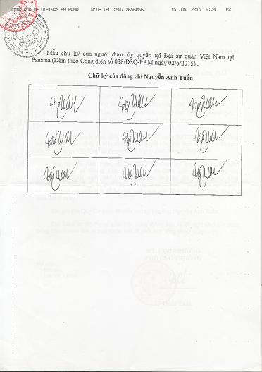 Thực hiện Quyết định số 05/2002/QĐ-BNG ngày 30/7/2002 của Bộ trưởng Bộ Ngoại giao quy định về việc tổ chức giải quyết công tác lãnh sự, căn cứ đề nghị của Đại sứ quán Việt Nam tại Panama, Bộ Ngoại giao đồng ý chấp thuận: đồng chí Nguyễn Anh Tuấn - Bí thư thứ nhất, Đại sứ quán Việt Nam tại Panama được ủy quyền ký tất cả các giấy tờ lãnh sự, trừ hộ chiếu ngoại giao và các giấy tờ mà pháp luật về hộ tịch, quốc tịch quy định do người đứng đầu Cơ quan đại diện ký.