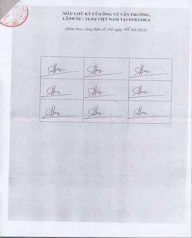 Bộ Ngoại giao đồng ý chấp thuận: Đồng chí Vũ Văn Trường – Lãnh sự tại Tổng Lãnh sự quán Việt Nam tại Fukuoka, Nhật Bản được ủy quyền ký tất cả các giấy tờ lãnh sự