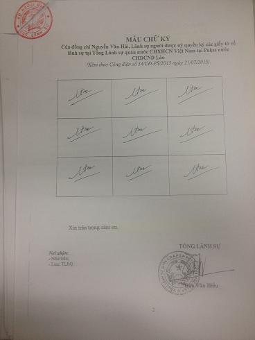 Ngày 14/8/2015, Cục Hộ tịch, quốc tịch, chứng thực nhận được Công văn số 2355/CV-LS-LSNN về việc giới thiệu chữ ký lãnh sự của đồng chí Vũ Văn Trường, nội dung cụ thể như sau: