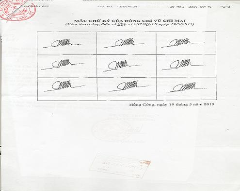 Thực hiện Quyết định số 05/2002/QĐ-BNG ngày 30/7/2002 của Bộ trưởng Bộ Ngoại giao quy định về việc tổ chức giải quyết công tác lãnh sự, căn cứ đề nghị của Tổng lãnh sự quán Việt Nam tại Hồng Kông và Ma Cao, Bộ Ngoại giao đồng ý chấp thuận: bà Vũ Chi Mai – Phó Tổng Lãnh sự, Tổng lãnh sự quán Việt Nam tại Hồng Kông và Ma Cao, được uỷ quyền ký cấp gia hạn, sửa đổi, bổ sung các loại hộ chiếu, giấy thông hành; ký cấp sửa đổi, bổ sung các các loại hộ chiếu, giấy thông hành; ký cấp sửa đổi, bổ sung các loại thị thực; ký công chứng, hợp pháp hoá giấy tờ tài liệu; ký giấy tờ về hộ tịch, quốc tịch và các công văn, giấy tờ liên quan đến công tác lãnh sự trừ các giấy tờ hộ tịch, quốc tịch giấy tờ về lãnh sự, trừ hộ chiếu ngoại giao và các giấy tờ về hộ tịch và quốc tịch thuộc thẩm quyền của người đứng đầu cơ quan đại diện. Bà Vũ Chi Mai được ký kể từ ngày 01/6/2015. Bộ Ngoại giao thông báo 09 mẫu chữ ký của bà Vũ Chi Mai để các cơ quan, đơn vị biết, phối hợp.